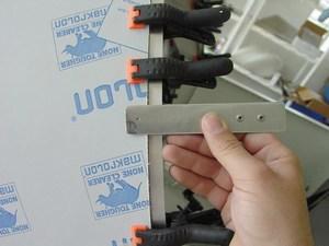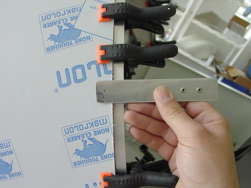 After all the edges are sanded, the windscreen is once again clamped into position to prepare for drilling.