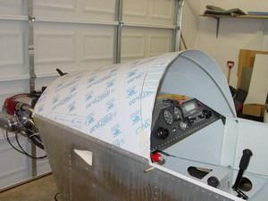 The Sonex uses a two part canopy and windscreen. The forward windscreen in a flat-wrap of acrylic sheet, while the movable part is a free blown acrylic bubble. The bubble comes oversized, and must be trimmed and attached to a frame.