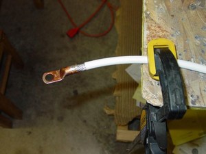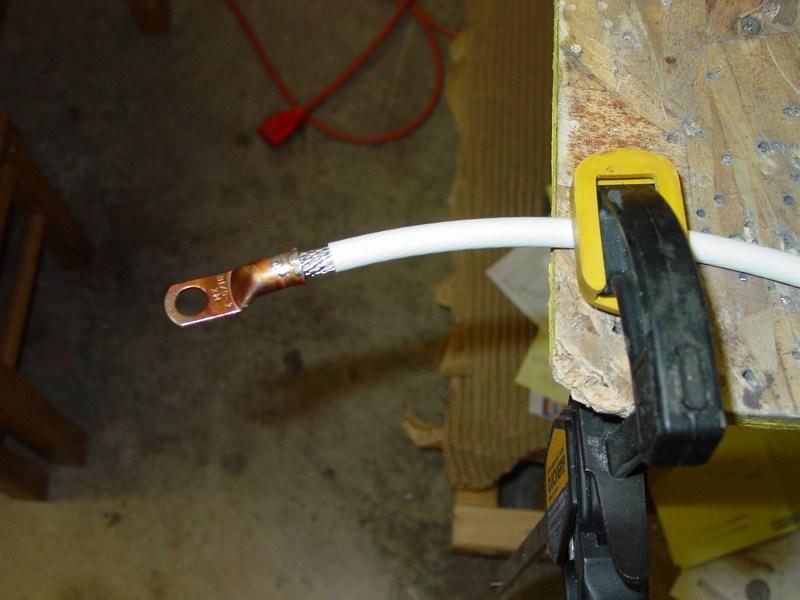 I chose to use 4 AWG wire for my battery and starter cables. Ends terminate into 1/4" copper ring terminals that must be soldered on with a torch. I drilled 2 small holes to allow soldier to wick fully into the wire.
