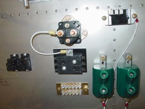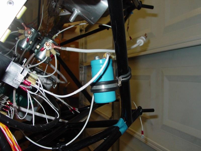 I am using this big heavy-duty capacitor to filter the regulator output. This should prevent any wayward spikes from reaching anything in my electrical system, as well as cut out any alternator noise in my headset. $20 from B&C Specialty.