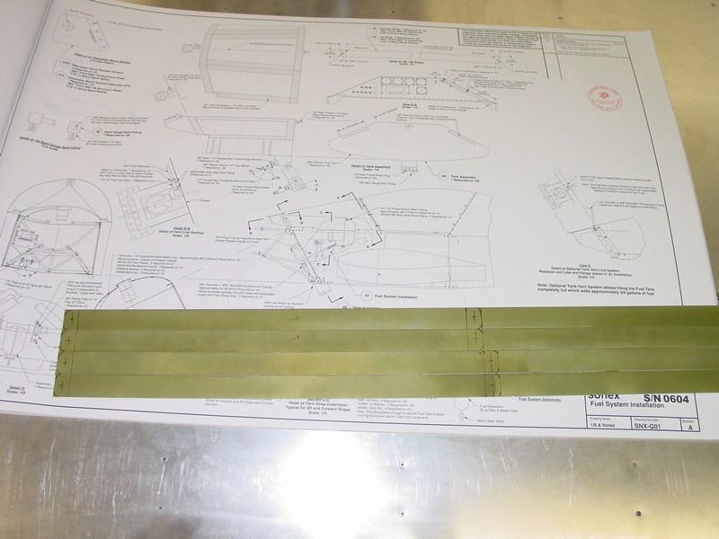 The fuel tank is held in place by steel or aluminum straps. The kit doesn't include any material for this, so you are on your own here. I purchased some 1" wide steel strapping from Aircraft Spruce. I actually bought 4 4'-lengths, thinking I could use two to make the 4 straps, and keep two as backup. Actually, 4' wasn't enough to make two straps from, so I used all 4 lengths (with lots of waste).