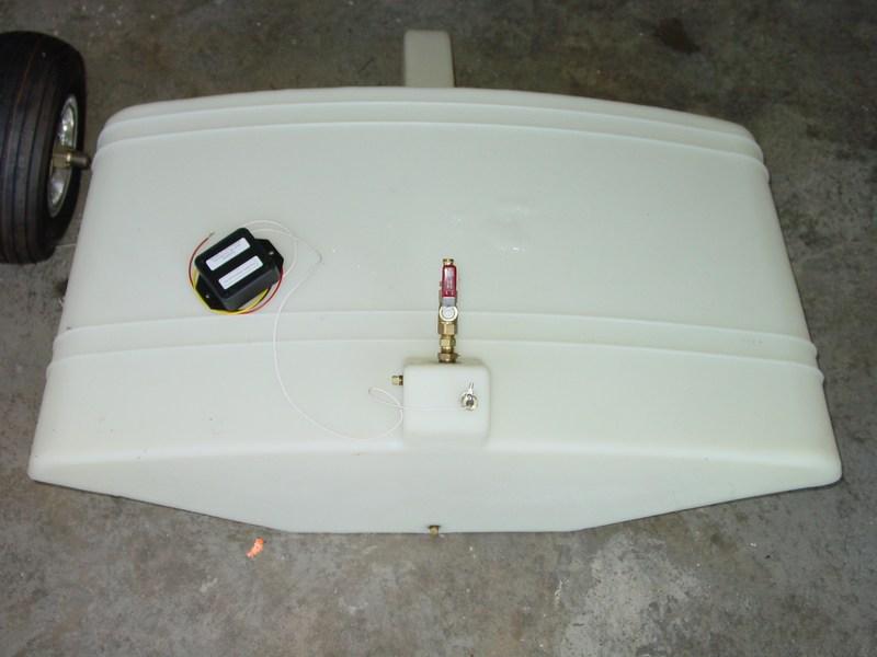 The Sonex fuel tank is a heavy-duty rotationally molded tank. Total capacity is 17 gallons. It has fitting for the fuel sight tube, a capacitance fuel probe, and the sump and pickup lines. Since I am using the optional capacitance probe, I plugged the sight tube lines. The pickup gets a finger strainer and shutoff valve.