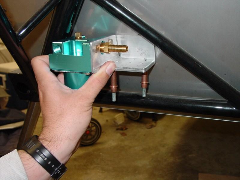 I purchased a gascolator from Aircraft Spruce (PN 05-00632). The ports are arranged so that fuel flows in through the mounting side, and out on the ends. This would be fine, except for the fuel line interference with the rudder pedals.