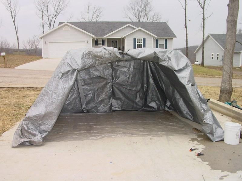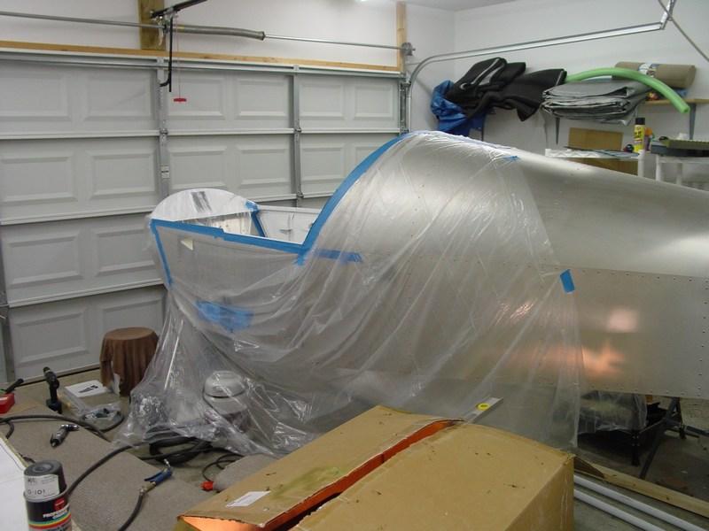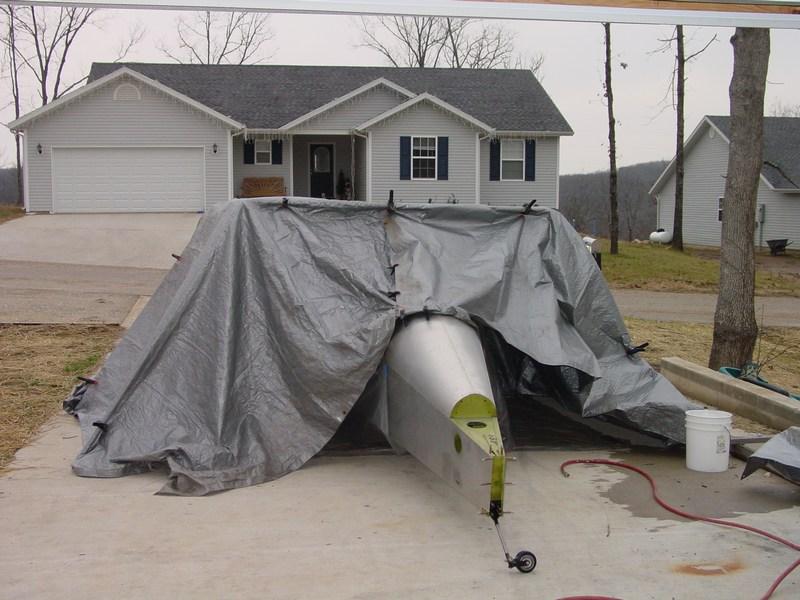 To spray the cockpit area, I set up a temporary paint tent in the driveway. The inside is lined in thin plastic sheet, and the outside is covered in tarps to break the wind.