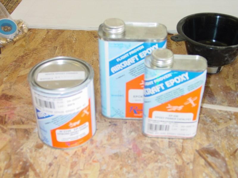 I decided early on that I was going to paint the cockpit area. The main reason for this was because I planned to prime all the cockpit pieces. Unfortunately, this would look terrible as a finished cockpit. It might be possible to upholster the cockpit, but this seemed impractical and excessive. I wanted something to cover up the primer as well as provide a tough, wear resistant finish in the cockpit. I settled on Randolph 2-part epoxy white primer. Not being sure about the quantity of paint required, I ordered a one quart kit (included paint, catalyzer, and reducer) from Aircraft Spruce for around $50. This turned out to be not quite enough to get the job done, and I ordered a second quart.
