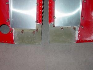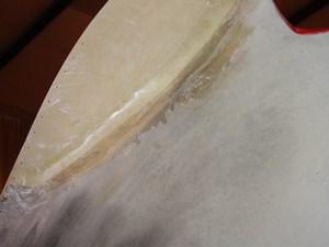 The inside edge of the transition is reinforced with one or two layers of fiberglass. I used strips of medium-weight cloth, cut into 2" wide tapes. The tapes bridge over the transition and add much-needed strength and stability to the joint. This will prevent the joint from flexing and cracking around the micro on the outside.