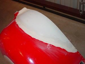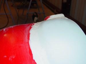 After the blister has been fiberglassed into place, the outside seam gets a layer of dry micro (micro balloons and epoxy mixed to the consistency of cake frosting) to help smooth the transition.