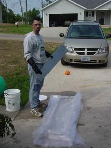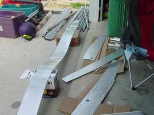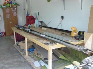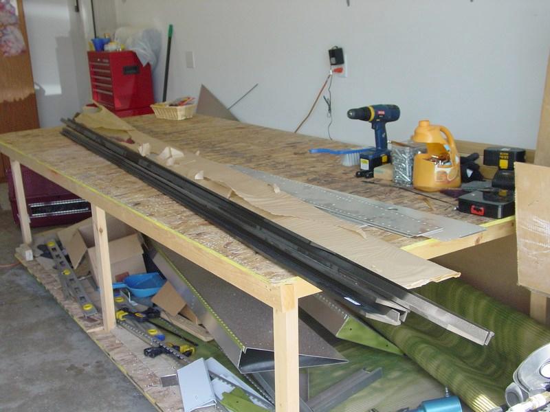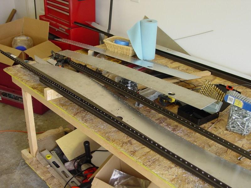 Here is where the wings started. After 4 months in storage, I finally got to unroll the main spar webs and retrieve the spar caps from their storage perch in the garage. Aside from some accumulated dust, they looked VERY nice! The machining is excellent. The spar caps consist of 4 6061-T6 aluminum extrusions, shaped with a custom (proprietary) "T" cross section. Each cap is slightly different. Sonex sells them fully finished and anodized. After looking these over closely, I have new respect for those early builders that had to cut the caps themselves. That would amount to over 90 ft of cuts, and then you would still need to file and dress the edges!