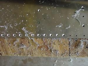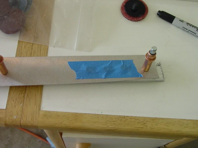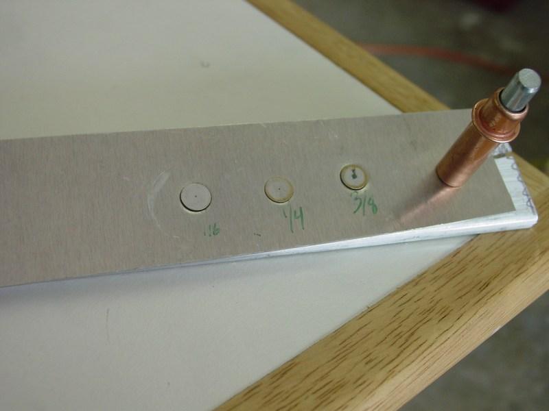 This test piece was set up to test out flush rivets, and dimpling into the countersink. The flush rivets are set into the holes and held in place with tape. Then the bolt is set on the flush head and whacked.