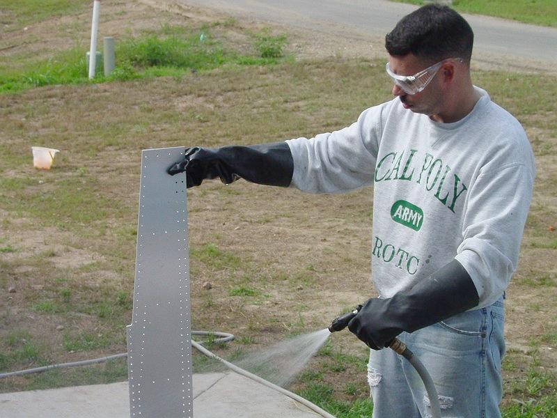 The parts are rinsed well to remove all traces of acid. You need to pay particular attention to the rivet holes, as they like to hold acid in them. If the water sheets off the surface without creating bubbles, it is clean.
