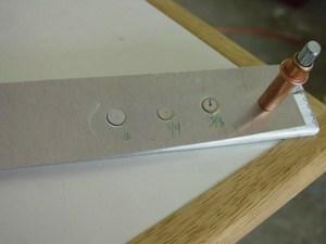 This picture shows my countersink depth/diameter test. I dilled and countersunk three holes. Each hole was countersinked a little deeper. This depth correlated to the diameter, and that was marked next to each hole. I found that anywhere from 1/4" to 3/8" diameter countersink would work, although the smaller holes were ever-so-slightly raised up from the surface. Conclusion: countersink diameter is not as critical as I thought it would be.