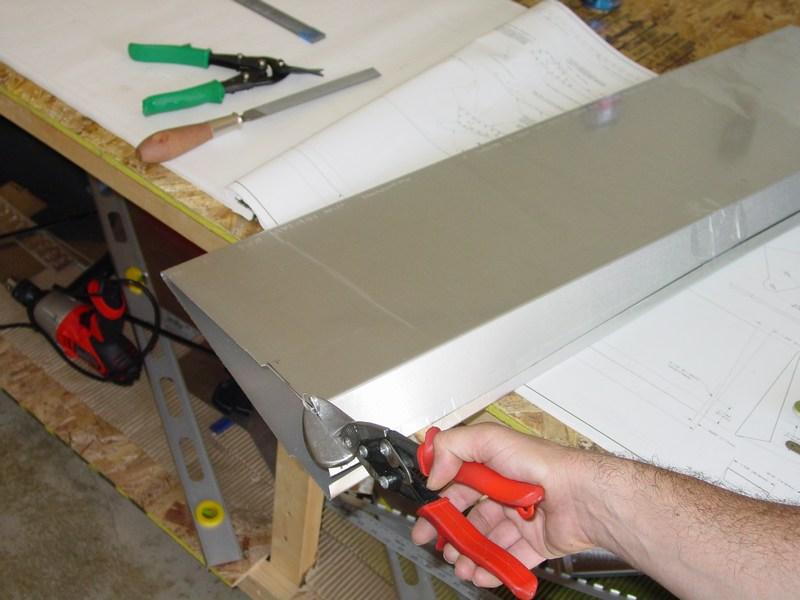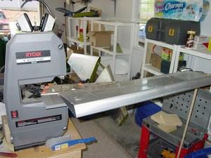 I debated on how to cut the skin. Using the snips might be tricky due to the taper and tight corners of the skin. The edges may also get bent up from the jaws of the snips. So, I decided to cut it on the band saw. This worked ok, but right at the end of the skin the blade tended to catch and bend the flange a bit. Inserting a rib or some type of stiffener would help prevent this.