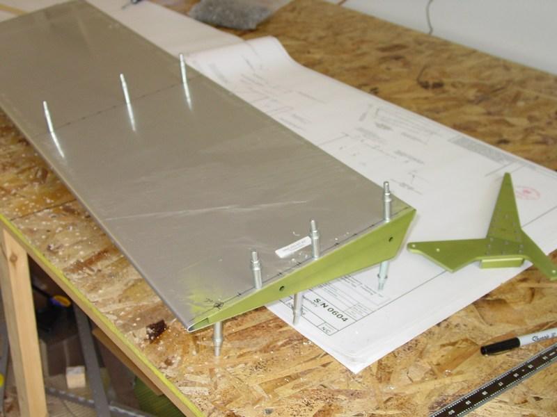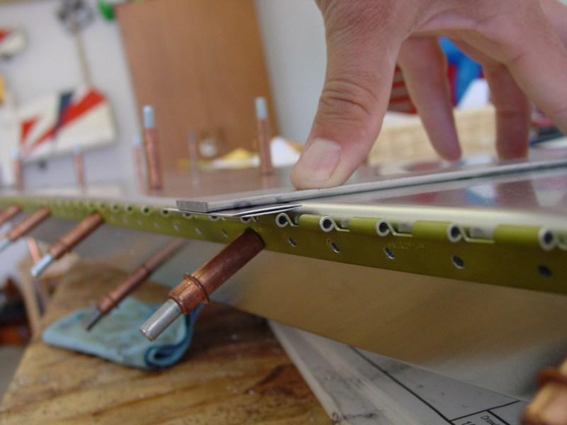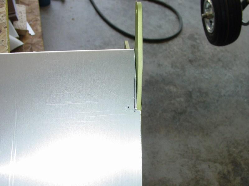 The small angle must be aligned with the flanges of the forward and aft ribs. I used scrap 1/8" aluminum clamped against the flanges to hold it while I drilled it in place.