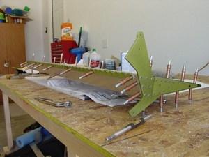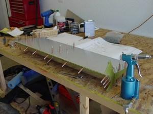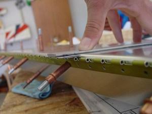 The ribs were fitted using the same blue centerline trick on the rib flanges. This proved to be easy, but the skin had a big tendency to twist out of a flat planar alignment. I paid particular attention to this so that the rudder did not have a built in twist.