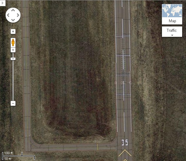 My previous experience with my Sonex led me to believe that the basic handling qualities, speeds and techniques could be "reused" with this aircraft, and I already felt very comfortable with this. I simply wanted to confirm the handling and performance numbers of the new airplane and complete the POH charts. Additionally, I wasn't looking to determine maximum performance, such as the absolute shortest takeoff distance. In my opinion, this was of limited usefulness; having a super-short takeoff number is great for bragging rights and that occasional tight spot, but how often am I likely to need that maximum performance takeoff? A much more useful test focuses on the "typical" takeoff. I define a typical takeoff as one that uses a common takeoff technique, requires no extraordinary attention to detail or precision in execution, and can be reasonably executed 90% of the time. In other words, if I just go out and fly without thinking too much about it, what can I reasonably expect. This inherently builds in a large safety margin into the performance charts contained in the POH. I know with a little more attention to detail I can beat the book figures, and I rarely have to worry about being worse. I'll just have to live with the "embarrassment" of having the longest takeoff distance in the fleet! To perform this test series, I flew to a nearby airport that gets almost no use. The runway is in good condition, with clear approaches, and has convenient distance marking painted across the surface. This would allow me to make a note of my liftoff or touchdown points without requiring an observer on the ground. I then confirmed the distances using Google Earth and called it good. I'll mention my notion of "acceptable accuracy". To me, accuracy to nearest 100 ft is acceptable. At takeoff speeds, if the actual distance is off one way or the other by 25, 50 or even 75 ft, that translates into about 0.5-1.0 seconds in the cockpit. If your takeoff is 1 second from disaster, then it most certainly isn't a "typical" takeoff! The following images show the layout of the airport and the marking I used for reference. The data collected was then entered into my spreadsheet for analysis. There are two tasks that are accomplished. First, some attempt has to be made to "normalize" the data. My test data was gathered at 7,000 ft Density Altitude (DA) with a 5 mph headwind. The data needs to be corrected to remove the effects of the added DA and wind, returning it to Sea Level (SL) no-wind performance. Using well-established rules of thumb (see the spreadsheet) the "measured" perfomance was corrected to "SL no-wind" performance. From here, the second task was performed mostly automatically - calculating the full performance charts for Takeoff and Landing distances at various DA's and weights. All my tests were performed at 950 lbs, and the spreadsheet calulated an expected distance at gross weight (1200 lbs for this aircraft). I'll go back and fly a couple of tests at full gross to confirm, but in past experience, they usually come out pretty close. The final result is two charts that contain the applicable performance numbers that are ready to place in the POH. If you're done climb tests and crunched those numbers to produce climb angles, then the spreadsheet will automatically calulate distance over a 50-ft obstacle as well!